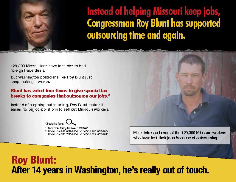 I have noticed that there's been a ton of mail in the northeast part of Missouri attacking Roy Blunt for voting to give tax breaks to companies that outsource jobs and then connecting that to 129,300 jobs lost in Missouri...